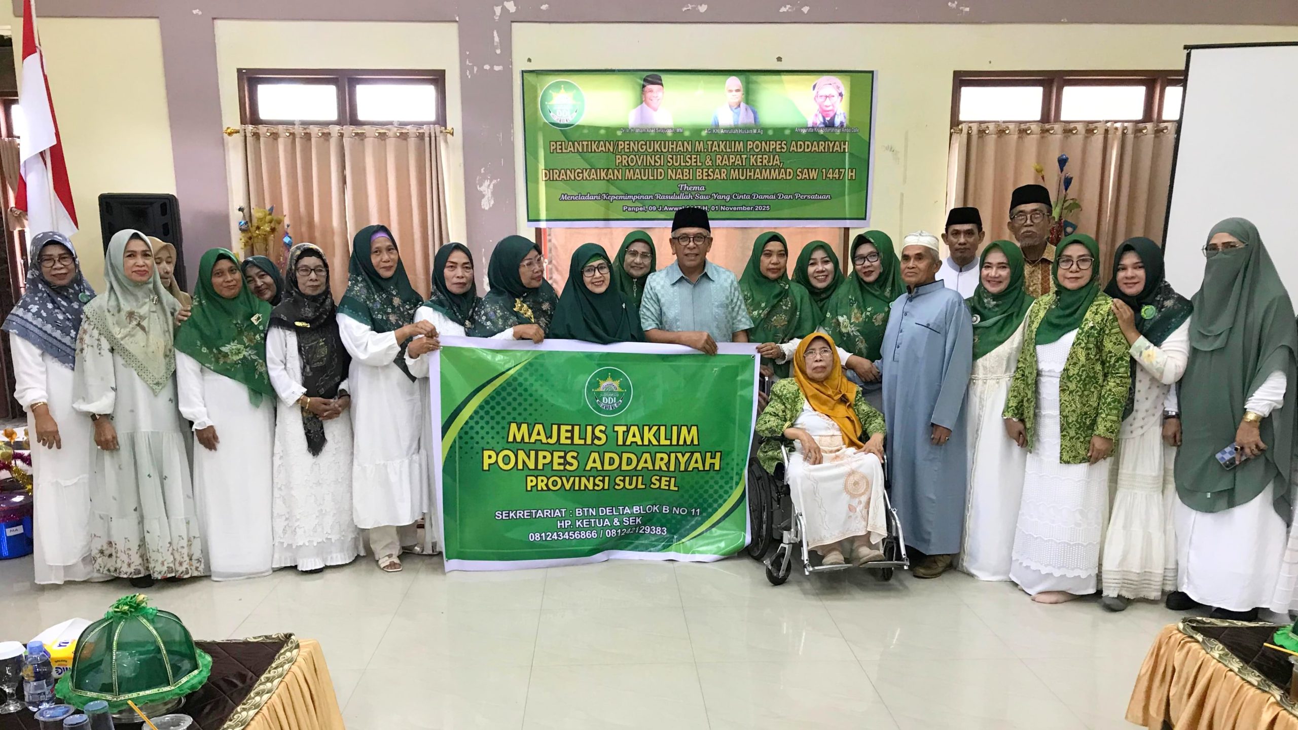 Turut hadir Pimpinan Pondok Pesantren Addariyah Sulsel, K.H. Amrullah Husain, yang mengingatkan pentingnya menjadikan peringatan Maulid Nabi sebagai momentum memperdalam kecintaan kepada Rasulullah SAW serta meneladani kepemimpinannya dalam kehidupan sehari-hari.