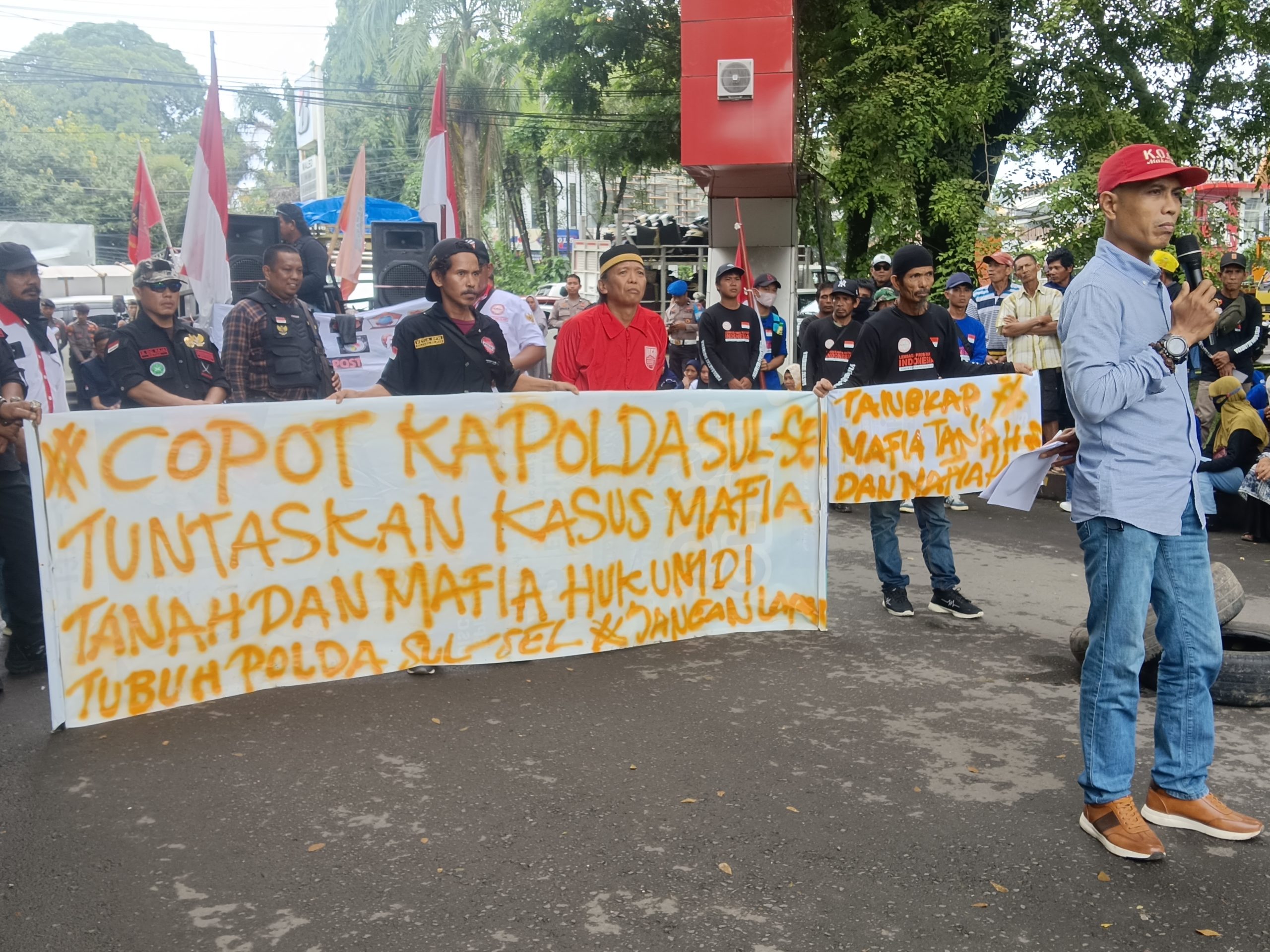 -Makassar, Senin (15/12/2025). Pukul 13:30 Wib – Ratusan anggota Gabungan Mahasiswa dan Organisasi Masyarakat (Ormas) berkumpul di area depan Mapolda Sulawesi Selatan, Senin pagi. Aksi ini dipimpin oleh Kuasa Hukum Ishak Hamsah dan Andi Salim Agung S.H, CLA (yang bertindak sebagai Jenderal Lapangan Aksi), dengan tujuan menuntut penindakan tegas terhadap sejumlah pihak yang diduga terlibat dalam kasus mafia tanah dan penyalahgunaan wewenang di lingkungan institusi hukum di Makassar.