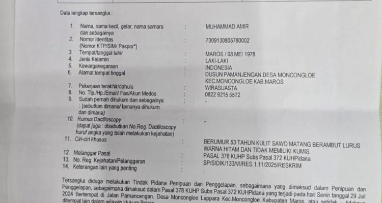 Polres Maros Terbitkan Surat DPO Terhadap Mantan Kades Moncongloe Maros Maros|Oktober 3, 2025oleh Redaksi Maros, Prokontra.online – Kepolisian Resor (Polres) Maros resmi menerbitkan surat Daftar Pencarian
